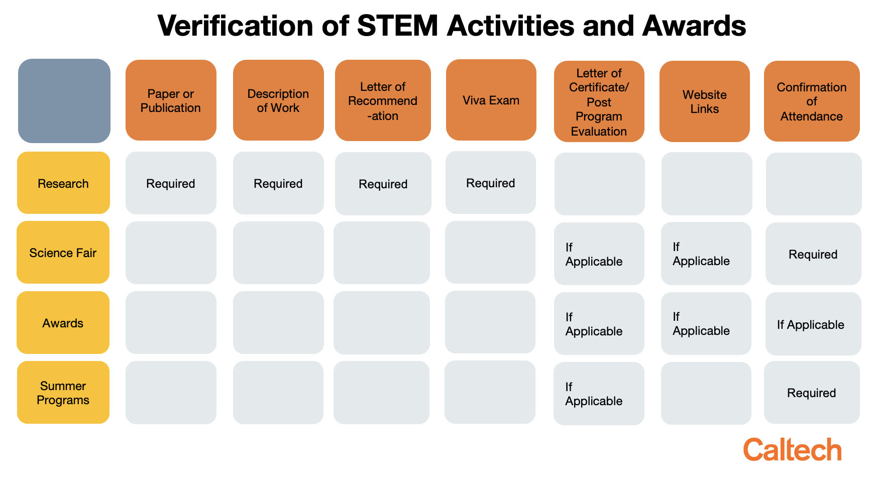 The categories below outline the types of experiences Caltech may ask you to verify, along with the materials you will need to submit.