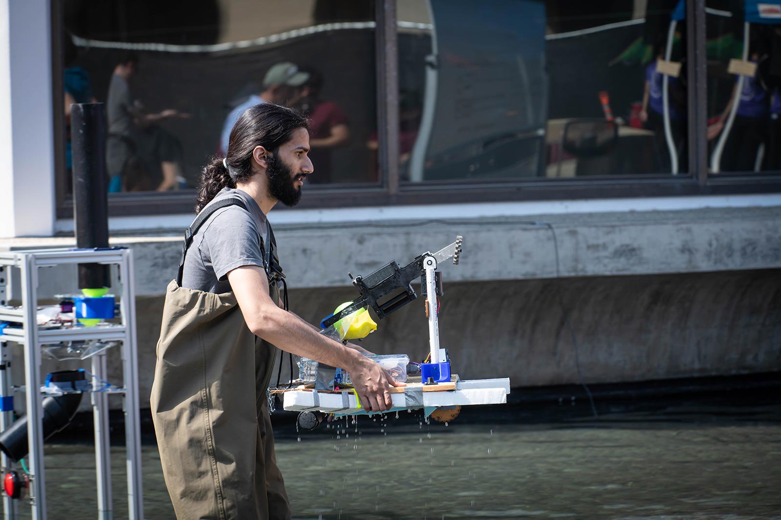 Five teams of Caltech undergraduates spent months building three amphibious remote-controlled robots per team that could drive into Millikan Pond and speed across the water to drop, shoot, or push balls into targets and outscore the opposing team. It was a high-stakes afternoon of capsizing, cheering, and triumph.