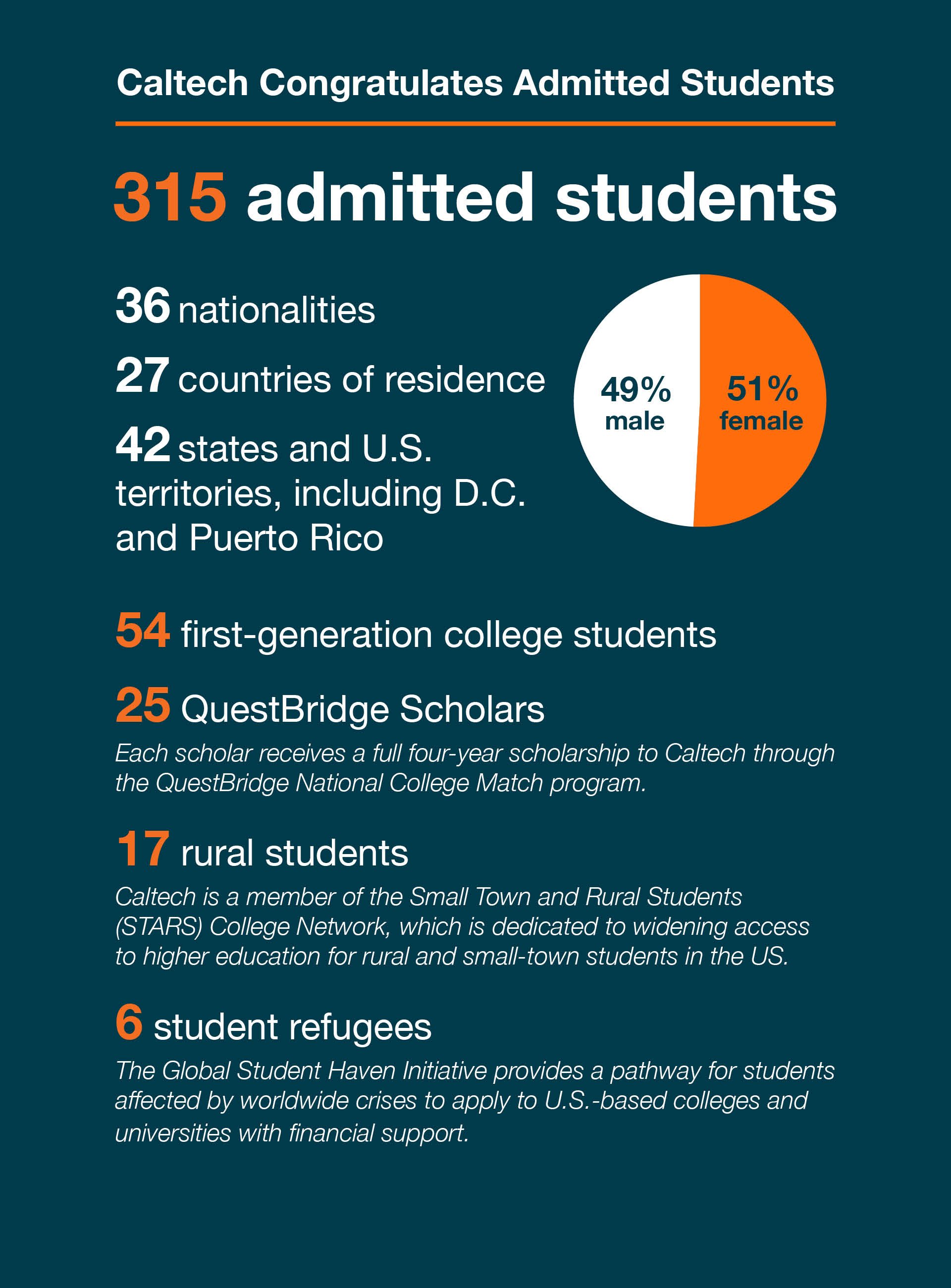 "Getting to know these young people over the course of the admissions process is both an inspiration and a delight," says Caltech's executive director of undergraduate admissions Ashley Pallie. "Students invited us into their lives and told us the stories of their triumphs and failures, showcasing depths of creativity and tenacity that we know will help them succeed at Caltech. I'm thrilled for who these scientists and engineers will become and the impact their research will have on Caltech and the world."