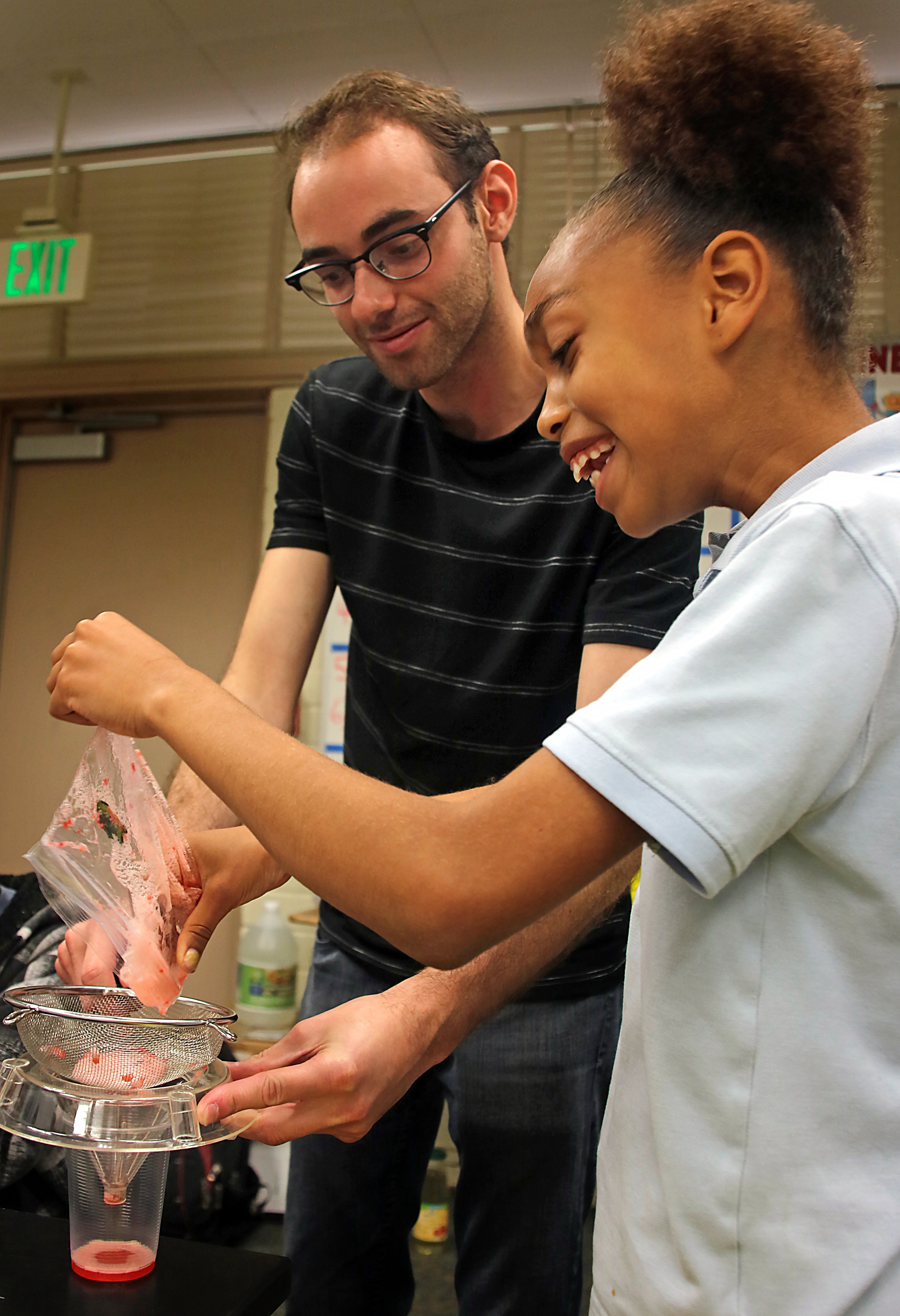 Conducting an experiment to extract DNA from plant cells, the kids enthusiastically squished strawberries in plastic baggies filled with a detergent-alcohol solution—creating a sticky red mixture that many children soon dribbled on themselves and their tables. But by the end of the lesson, each student was able to show off a vial of distilled DNA they had created and, in spite of the mess—or maybe a little bit because of it—they were thrilled to be able to do real science themselves.