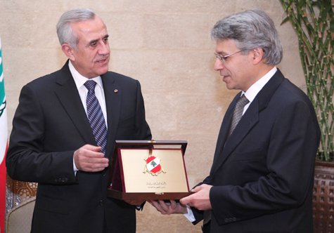 The President of the Republic of Lebanon Michel Sleiman presents George Helou with the Coat of Arms of the Presidency.