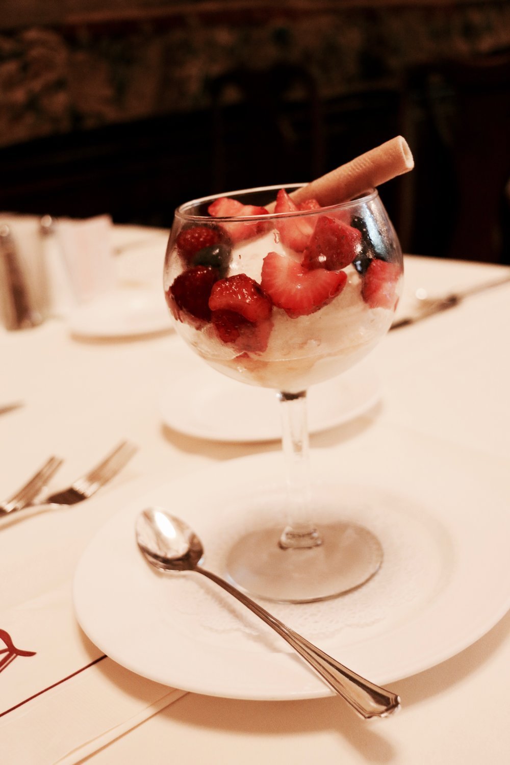 Scoop the ice cream into four frozen stemmed glasses. Mix the berries together and spoon over the ice cream. Drizzle the Grand Marnier over everything and serve with the gaufrette cookie.