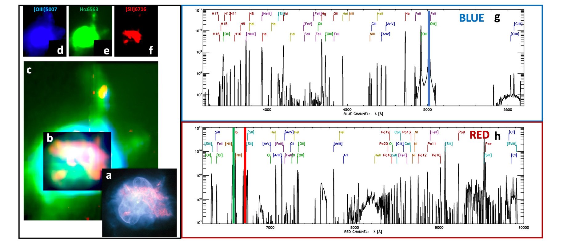 The Keck Cosmic Web Imager (KCWI) and its recently installed partner, the Keck Cosmic Reionization Mapper (KCRM), have obtained a spectrographic image of the Turtle Nebula, or NGC 6210, a complex planetary nebula created by a hot, dying star (that may in fact be part of a triple star system), located about 6,600 light-years away in the Hercules constellation. The star, which has blown off an outer envelope, is exciting the nebula gas with radiation from its recently unveiled hot inner core. Panel "a" shows a Hubble Space Telescope image of the nebula, and panel "b" shows the KCWI and KCRM image in three emission lines, coded by colors (blue, green, and red) as seen in panels "d," "e," and "f." Panel "c" shows the outer portion of the nebula captured by KCWI and KCRM, including two faint, extended filaments (the "arms" of the turtle). The spectrum of the nebula is shown at right, extending over 350 to 1,000 nanometers, most of the optical wavelength range of the instruments. More than 80 individual spectral lines from many elements in the periodic table can be seen.