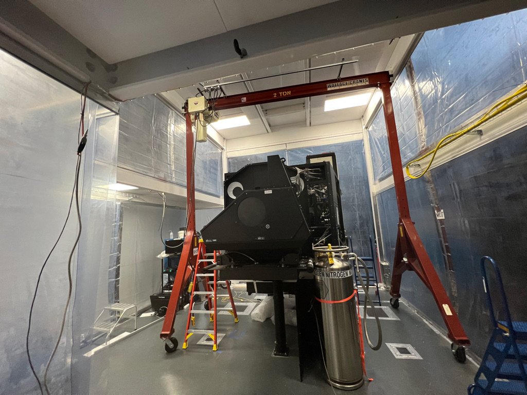 Chris Martin, the principal investigator of the Keck Cosmic Web Imager, inspects the instrument in a clean room at Caltech.