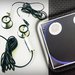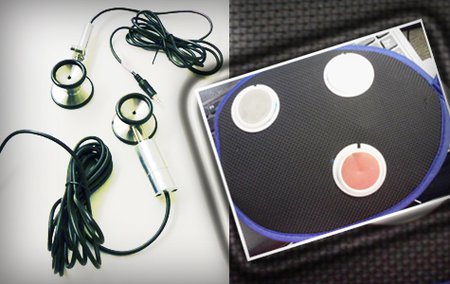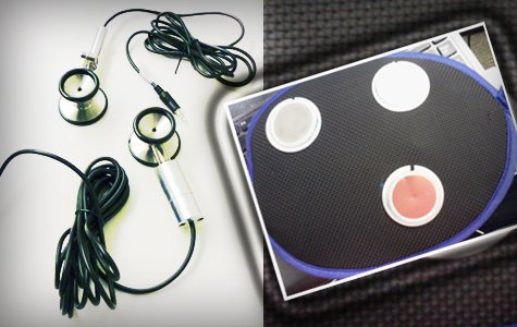 The wired stethoscope and oven mitt are the prototypes of devices designed to be plugged into cell phones. The stethoscope has a microphone and electronics housed within a custom-made aluminum case. Incorporated within the mitt are three piezoelectric sensors. The user can simply slip on the mitt and hold it up to his or her heart to record both heart rhythms and the electrical signals that make up an electrocardiogram (ECG).