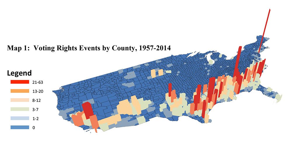 The decision, says Kousser, was wrong. In a comprehensive study recently published in the journal Transatlantica, he, with the help of three Caltech students who worked on the study during Summer Undergraduate Research Fellowship (SURF) projects, examined more than four thousand successful voting-rights cases around the country as well as Justice Department inquiries and settlements and changes to laws in response to the threat of lawsuits. Over 90 percent, they found, occurred in the covered jurisdictions—indicating, Kousser says, that the coverage scheme was still working very well.