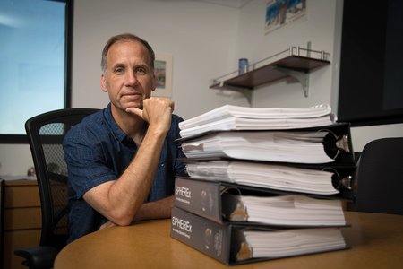 Jamie Bock, the mission's principal investigator at Caltech, with a stack of proposals that he and his team wrote as part of NASA's mission selection process.