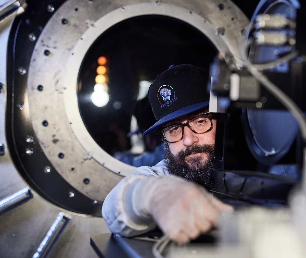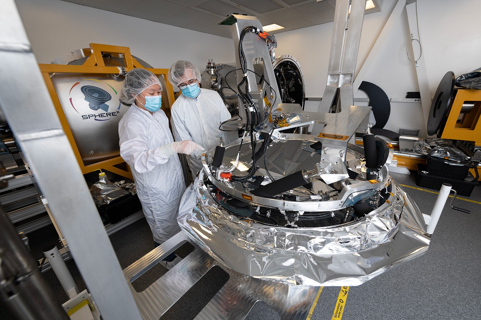 Amelia Quon and Konstantin Penanen of JPL work on the SPHEREx instrument at Caltech.