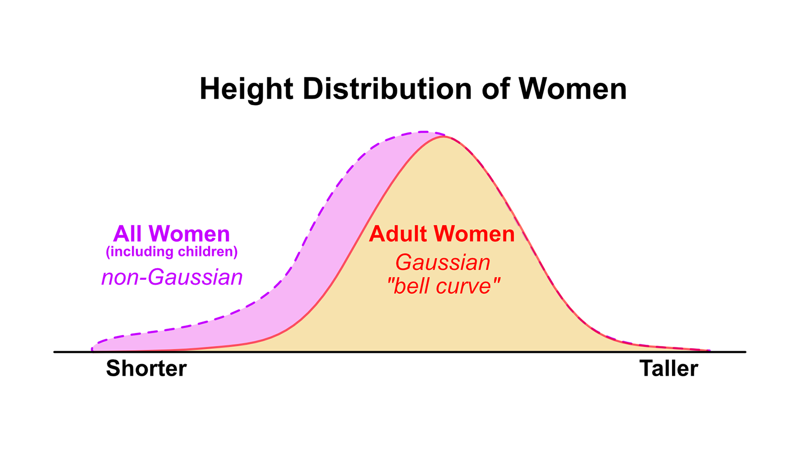 Using SPHEREx's galaxy maps, scientists will be able to look for a tantalizing feature of many theories of inflation that has been nearly impossible to address until now—namely, whether or not the distribution of tiny ripples of matter formed at the time of inflation follows a so-called Gaussian distribution. A Gaussian distribution, more commonly known as the bell curve, is a concept used in statistics. As an example, if you plotted out the heights for hundreds of adult women in the United States, the results would follow a bell shape, with most women measuring close to an average height of about 5'4", and fewer women being shorter or taller. This is a Gaussian distribution. But if you plotted out the sizes of all women, including children, you would not see a bell shape because the shorter sizes of the many children would skew things. The results would be non-Gaussian.